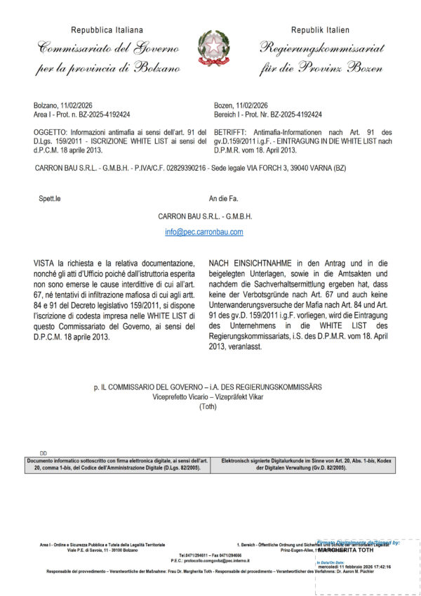 PEC-Mail: info@pec.carronbau.com – Empfängerkodex: M5UXCR1